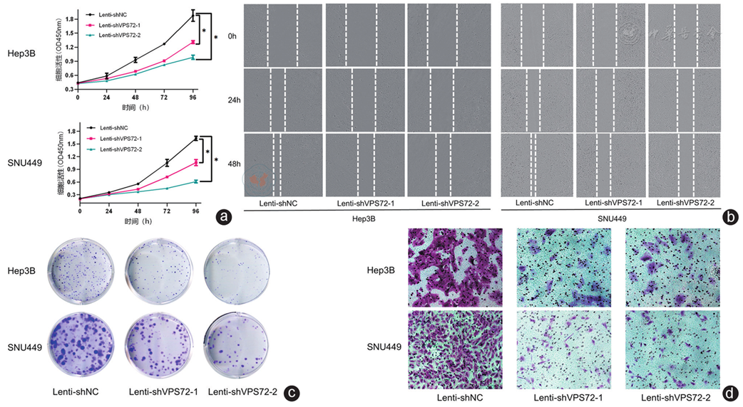图2 敲低VPS72抑制肝癌的增殖和迁移注:a为CCK8实验检测VPS72的敲低对肝癌细胞Hep3B、SNU449增殖能力的影响,*为P<0.001;b为细胞划痕实验检测VPS72的敲低对肝癌细胞Hep3B、SNU449迁移能力的影响;c为克隆形成实验检测VPS72的敲低对肝癌细胞Hep3B、SNU449增殖能力的影响;d为Transwell迁移实验检测VPS72的敲低对肝癌细胞Hep3B、SNU449迁移能力的影响