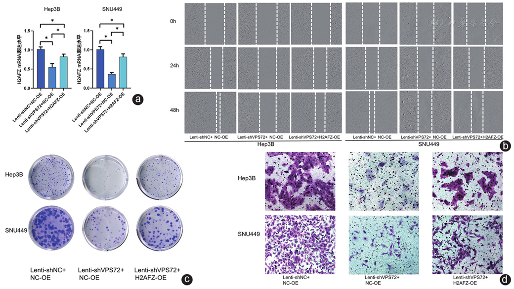 图3 过表达H2AFZ无法完全回复VPS72敲低对肝癌增殖和迁移能力的影响注:a为qRT-PCR验证肝癌细胞Hep3B、SNU449的Lenti-shVPS72组的H2AFZ过表达效率,ns为P>0.05,*为P<0.05;b为细胞划痕实验检测H2AFZ过表达对肝癌细胞Hep3B、SNU449的Lenti-shVPS72组的迁移能力影响;c为克隆形成实验检测H2AFZ过表达对肝癌细胞Hep3B、SNU449的Lenti-shVPS72组的增殖能力影响;d为Transwell迁移实验检测H2AFZ过表达对肝癌细胞Hep3B、SNU449的Lenti-shVPS72组的迁移能力影响