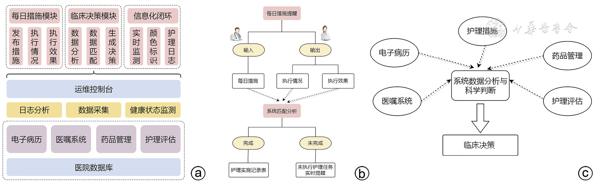 图1 互联网+ERAS信息化系统临床路径构建 注:a为架构图,b为每日措施提醒流程图,c为临床决策流程图