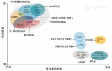 注:横坐标表示等位基因变异频率(代表人群频率由罕见到常见),纵坐标表示变异基因致病效应的大小(代表外显率由低到高),彩色圆圈代表基因,短线连接表示基因变异导致的疾病;根据人群频率和外显率可将肾脏病分为孟德尔肾脏病和多基因肾脏病2类,孟德尔肾脏病的相关变异罕见且外显率更高、单个变异即可致病,而多基因肾脏病相关变异常见但外显率低、需多个变异组合或与环境因素协同方能致病。