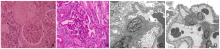 图1. 患者的肾小球光镜、电镜检查注:A:肾小球球性硬化(苏木精-伊红染色×400);B:肾小球节段性硬化,节段性硬化区域位于尿极处伴周边脏层细胞肥大(过碘酸-雪夫染色×400);C:系膜细胞和基质轻度增生,肾小球各部位未见确切电子致密物沉积(电镜×4 000);D:肾小球足细胞足突大部分融合(电镜×2 500)