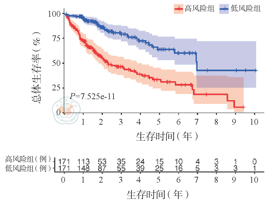 20 immune-related lncRNAs associated with the clinical prognosis of HCC patients were found out by Cox regression analysis. Risk stratification was an independent prognostic factor for HCC patients (HR=1.340, P<0.05). Survival prognosis became worse as the risk score increased. In the high-risk group, the mortality was 51.5%, and 20.5% in the low-risk group, where significant difference was observed (χ2=36.089, P<0.05). Kaplan-Meier survival analysis showed that the 1-,3- and 5-year overall survival rates in the high-risk group were 73.5%, 47.0% and 33.8%, significantly lower than 96.4%, 79.8% and 64.4% in the low-risk group (χ2=42.378, P<0.05). Correlation analysis revealed that most lncRNAs were highly expressed in the high-risk group, and the expression levels were up-regulated with the progression of HCC. GO function and KEGG pathway enrichment analysis indicated that immune-related lncRNAs might play a biological role through cell cycle, splice, endocytosis, purine metabolism, RNA degradation and cell cycle signaling pathway.